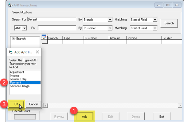 Add an AR Payment. (Go to AR > Transaction Processing, and then click Add. Select Payment from the list, and then click OK.) The AR Deposit Batch Running screen opens automatically.