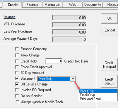• Click Email to send statements by email to the customers that have Email Only or Print and Email selected on the Credit tab of their customer record.