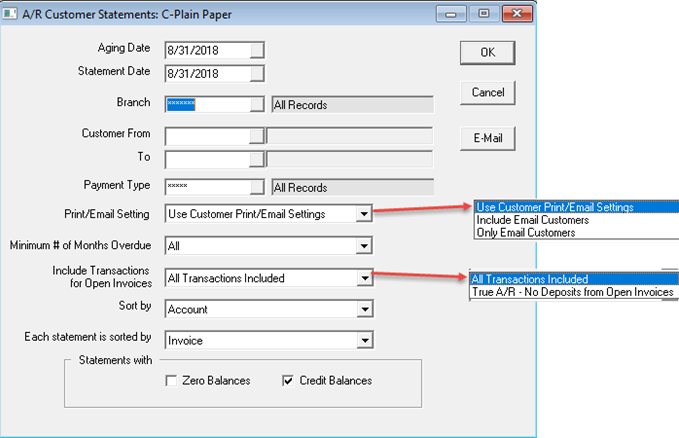 Include Transactions for Open Invoices: True A/R – No Deposits from Open Invoices is the option you should use; you generally do not want to see deposits on open invoices on the statements. Selecting All Transactions Included will print deposits from open invoices.
