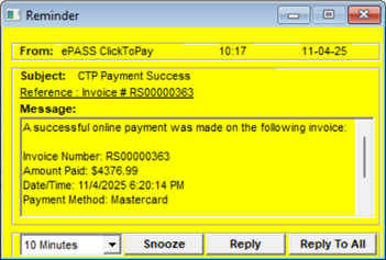 Message System Variables in EPASS allows you to configure the internal messages and pop-up reminders that are delivered to EPASS Users or Groups through the EPASS Messaging System. It includes settings to enable the messaging system, control how often it checks for new messages, and determine whether reminders should appear on top of other programs. Additionally, it provides detailed control over various message-triggering events—such as invoice creation, order cancellations, or service requests—allowing you to customize which events generate messages or reminders, and who receives them. EPASS messages and reminders also give recipients the options to reply to the sender or other EPASS Users.