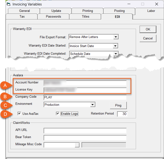 C In the Environment dropdown, select Production. (If you have paid for an AvaTax Sandbox account that you want to use for testing, select Sandbox instead.) D Verify that Use AvaTax and Enabled Logs are selected. NOTE: The Retention Period needs to be at least 30 days. This is an Avalara requirement. The transaction logs are located in the EPASS root directory. -