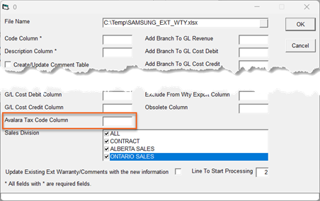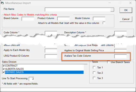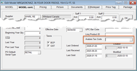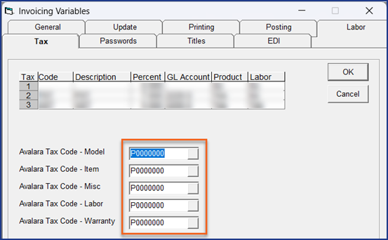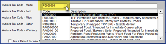 For models, items, labor, extended warranties, packages, or miscellaneous codes that require a tax code other than the default P0000000 generic code, you'll need to enter the codes manually or by using an import utility.