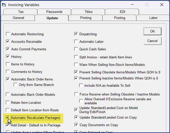 Taxes on Packages are calculated in two different ways, depending on how the Automatic Recalculate Packages option is set. This option is located on Invoicing Variables > Update.