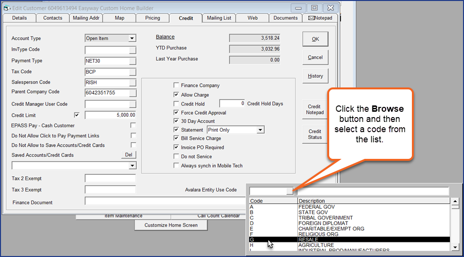 For each of your customers that qualify for a tax-exemption or special tax treatment, you will need to enter the appropriate entity use code to their customer record.