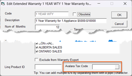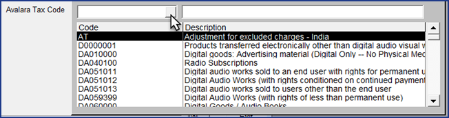 The codes in the dropdown list are populated from Avalara so the list will always be up to date.