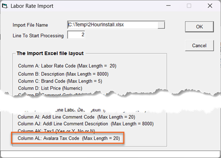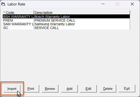 | Labor | Open the Labor Rate table and click Import. (Go to Tools > System Maintenance > Tables > Labor Rate) ![]() |