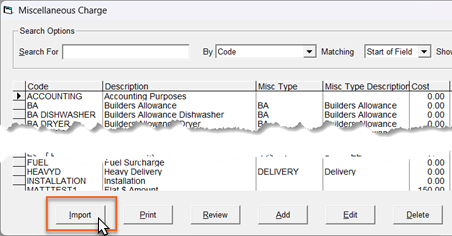 | Miscellaneous | Open the Miscellaneous Charge table and click Import. (Go to Tools > System Maintenance > Tables > Miscellaneous) ![]() |