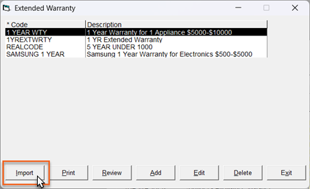 | Extended Warranties | Open the Extended Warranty table and click Import. (Go to Tools > System Maintenance > Tables > Extended Warranty) ![]() |
