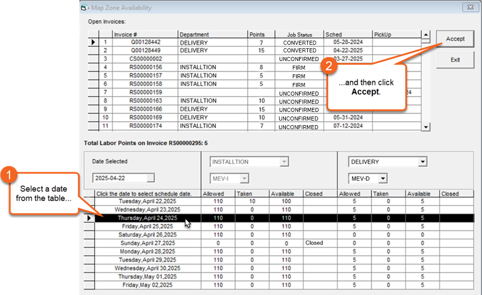 | D | This area shows the call slots that are open, taken, or closed for the invoice's Department and Map Zone. The dropdowns are locked and can't be changed. |