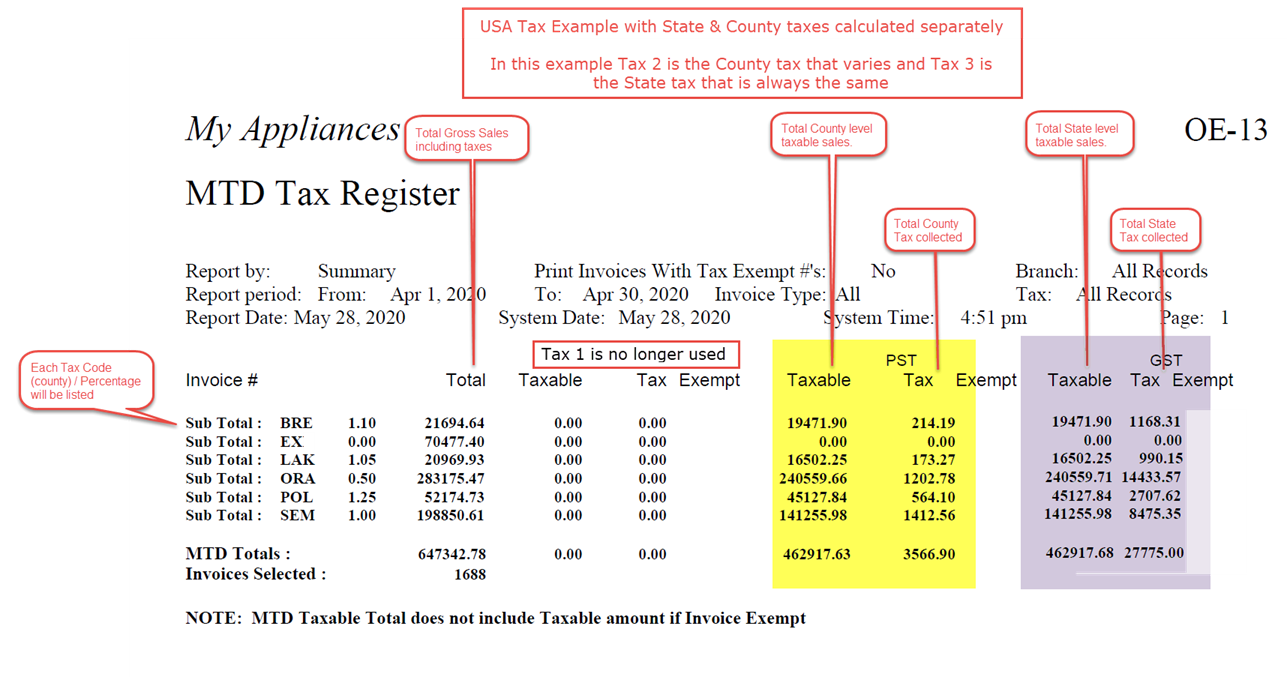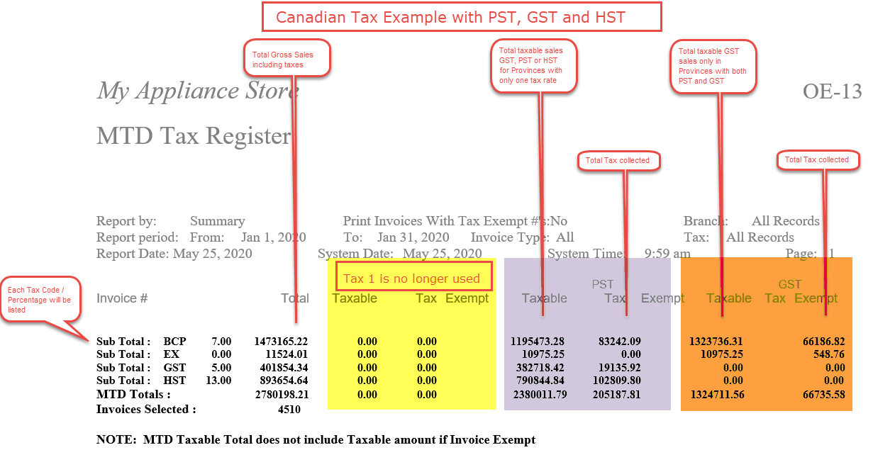 For MA at 6.25% the total sales including taxes is 801564.61. The middle column that is labeled ‘PST’ is Tax 2. There was 740927.35 of taxable goods sold. The difference (801564.61 – 740927.35 – 46307.96) 14329.30 is the non taxable product / services such as delivery fees. The sales tax collected was 46307.96.