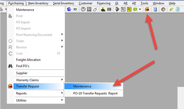 Transfer Requests Maintenance can be accessed through the Purchasing menu, and single transfer requests can be made using the button on the toolbar.