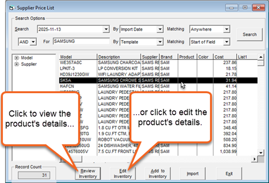 Once the import is finished, the Supplier Price List window is populated with all the products (models or items) that were imported. From here, you can select a product, and click Review Inventory to view the product's details or Edit Inventory if you need to make changes to them.