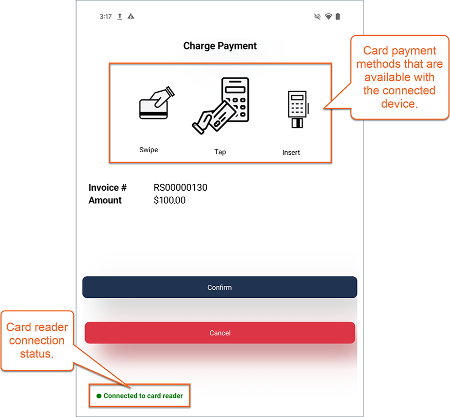 Verify that the card reader connection status is green (connected), tap Confirm, and then present the device to the customer for payment.